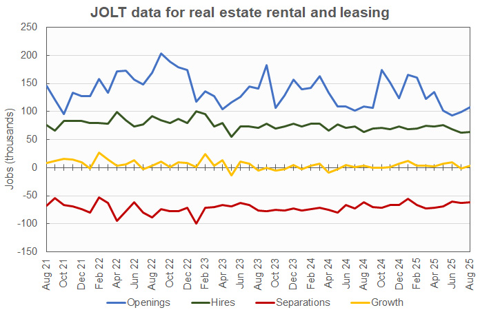 Total separations in the RERL jobs category in August were down by 2,000 from July’s revised (+2,000) figure at 61,000 jobs.