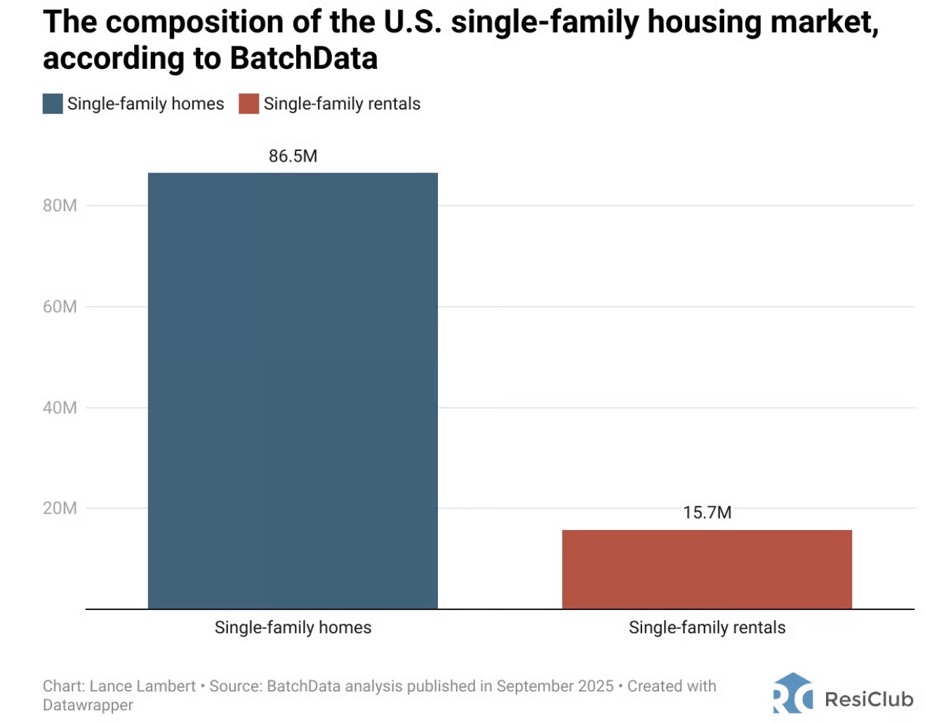 BatchData’s report calculates that the United States has 86.5 million single-family homes, of which 15.7 million are rentals. Nearly nine out of ten of those rentals belong to individuals or families who own no more than a handful of properties. That concentration underscores how decentralized the SFR market remains compared to the multifamily sector, where large institutional players dominate.