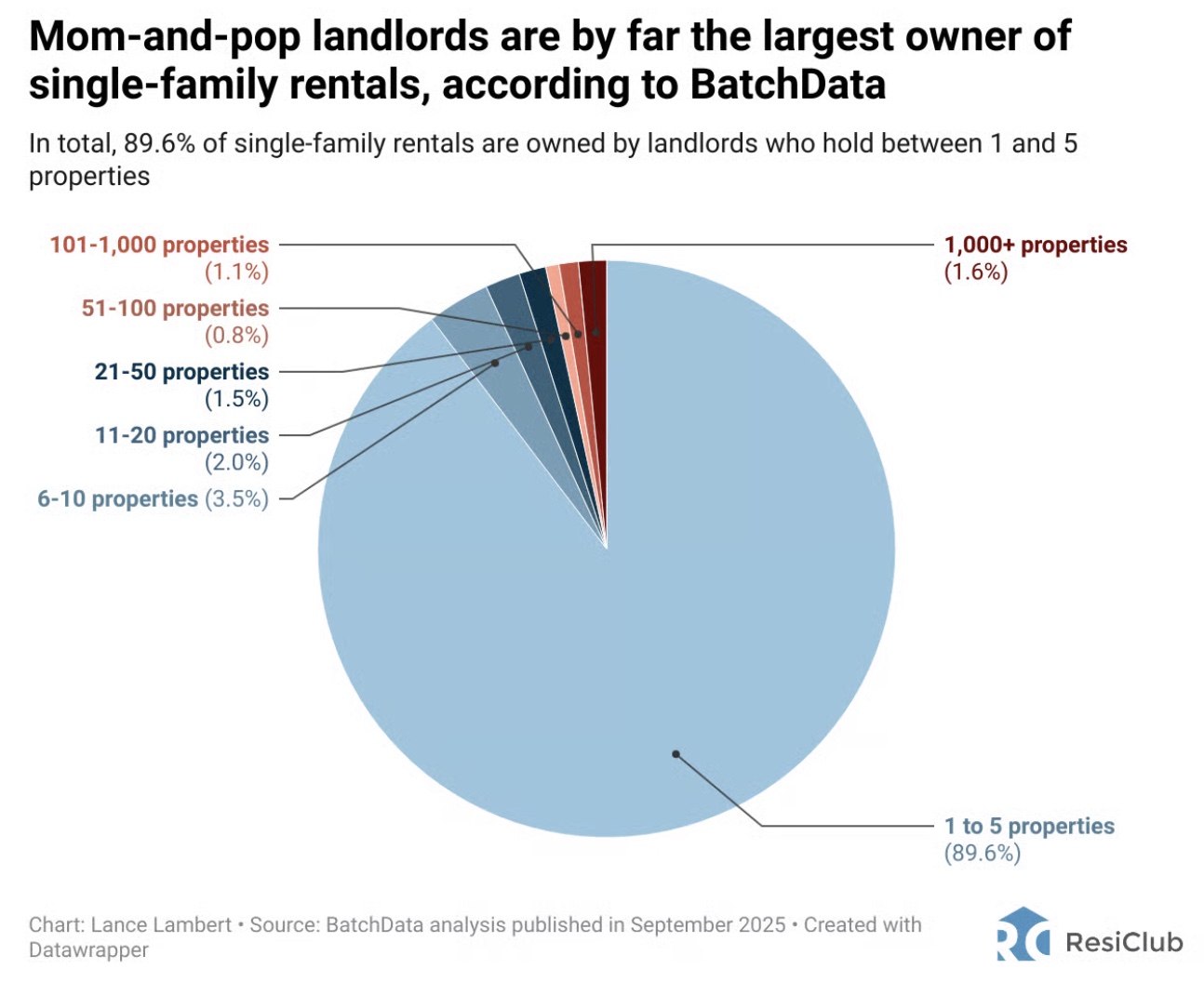Despite the steady drumbeat of headlines about Wall Street landlords and institutional investors buying up homes, the single-family rental (SFR) market remains firmly in the hands of small-scale owners. A new analysis from BatchData on the Resiclub analytics site shows that 89.6 percent of SFR are owned by landlords holding between one and five properties. These “mom-and-pop” landlords continue to provide the backbone of the SFR market, even as build-to-rent (BTR) firms expand in certain metros and grow their BTR inventories.